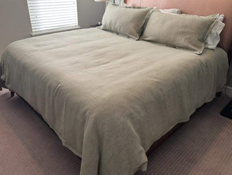 My husband and I love the Hotel Collection brand! This duvet cover stands up to the higher quality you expect. In some lights the fabric appears gray, and in others, a slight more green. We have gray and white Hotel Collection pillows that it pairs well with.