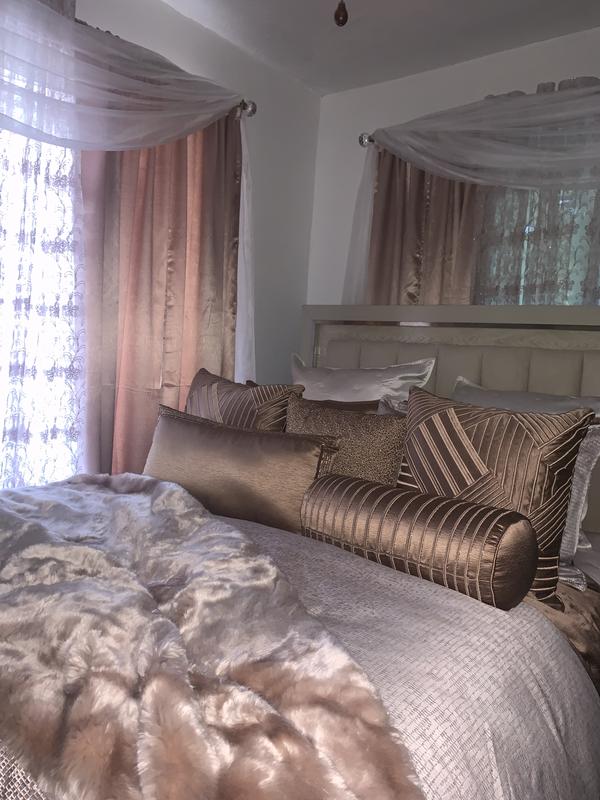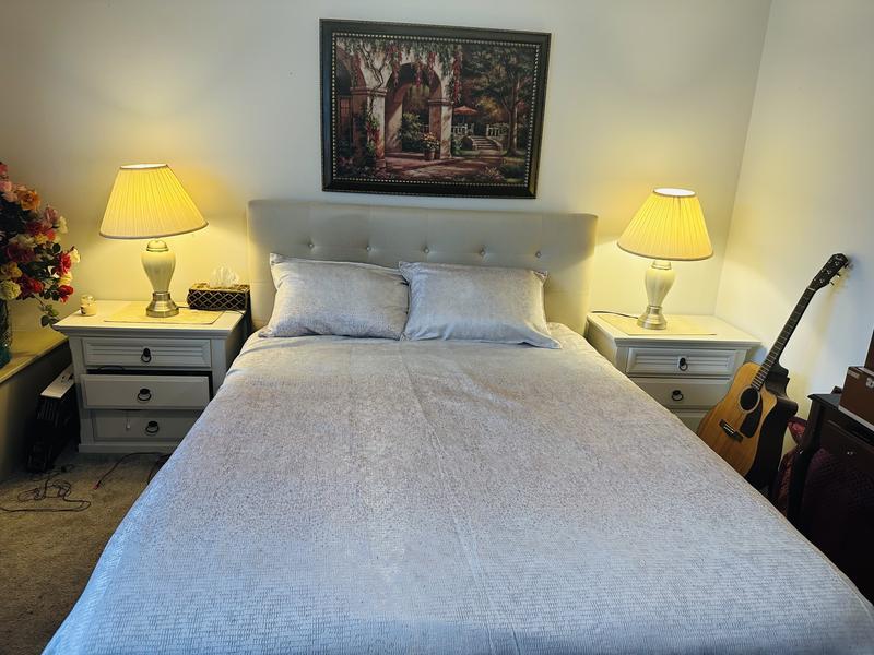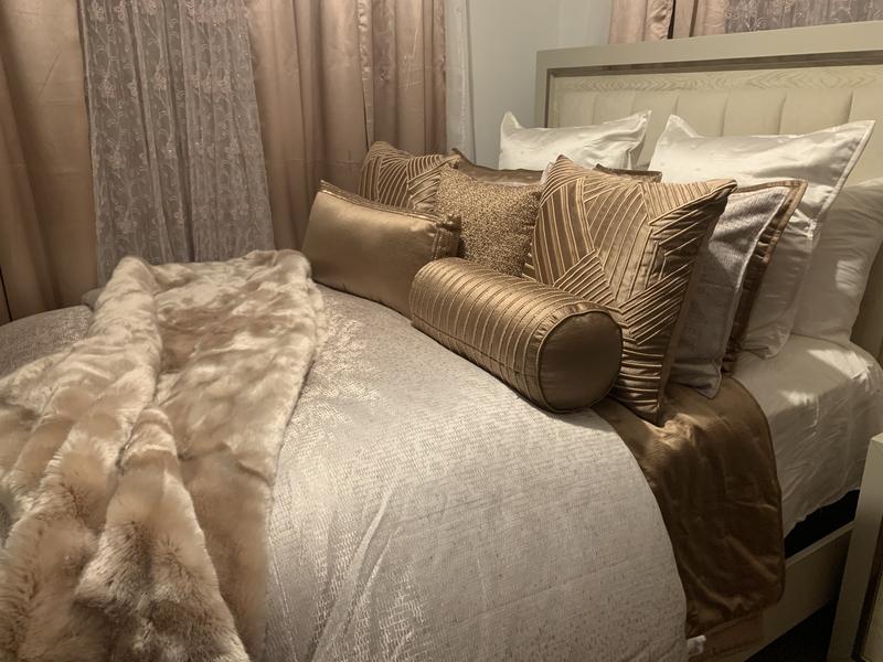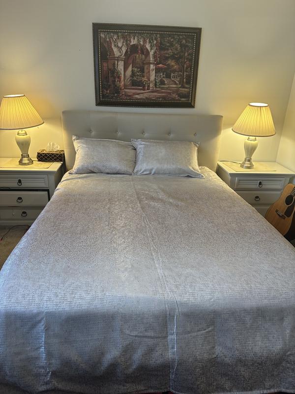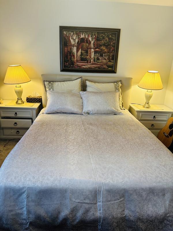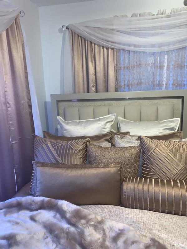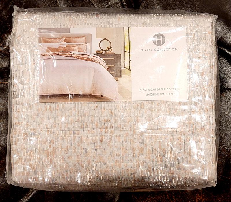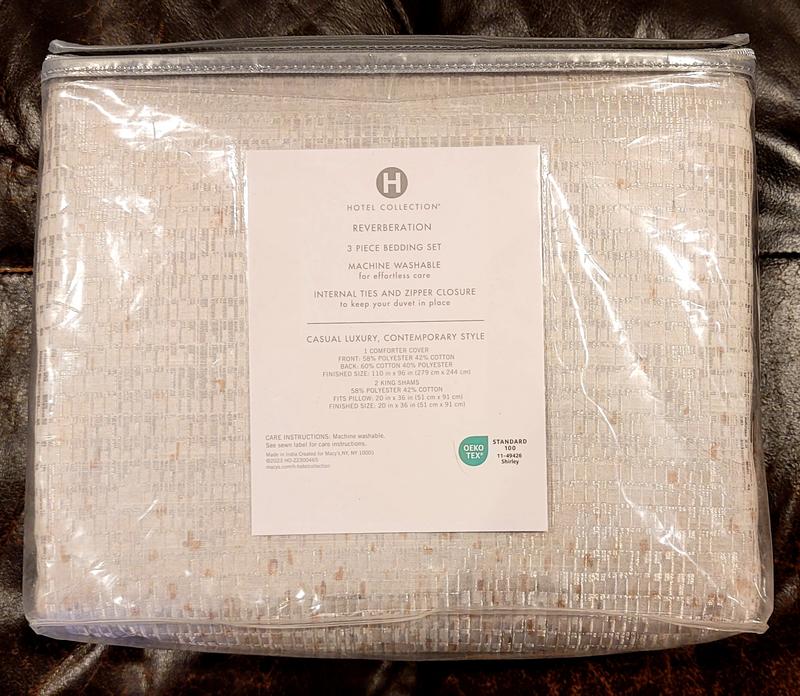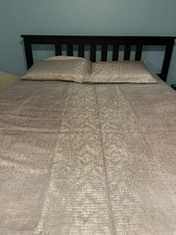 Quality material. The light gray, gold/rose color pattern is modern and matches my dark gray tufted headboard. I use the cover without a duvet insert. Very happy Witt this purchase.
