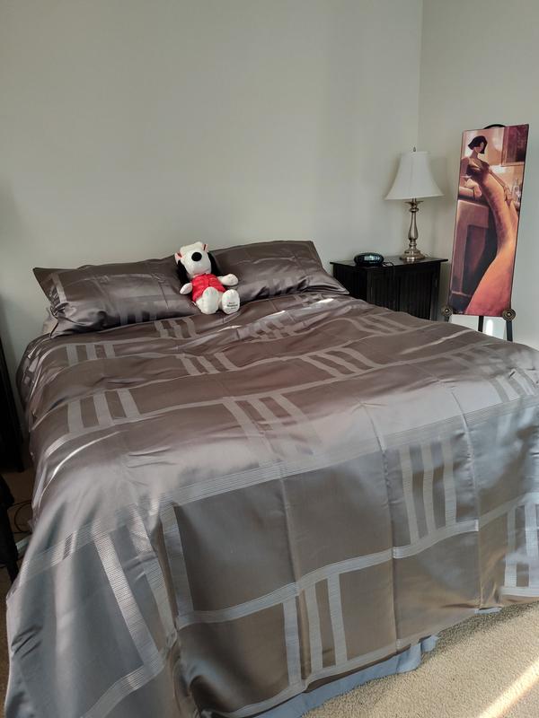 Love,love this comforter!. Has pretty decorative pillows to go with it. It is easy to find a white satin pillow if you need an extra pillow. Some reviews don’t like wrinkles. All you have to do is iron it with a warm iron. It’s lovely. It sparkles! It will look good with modern crystal lamps.