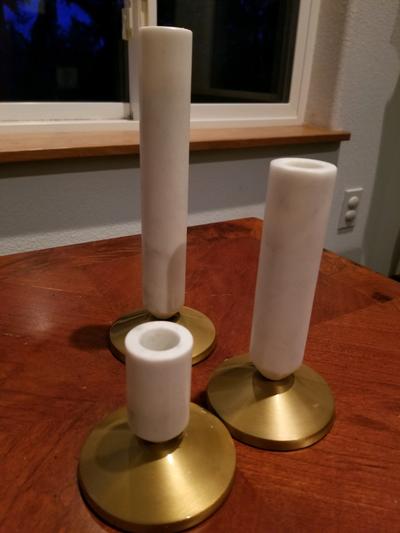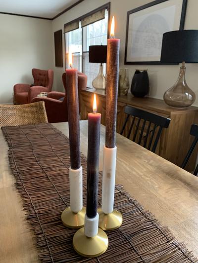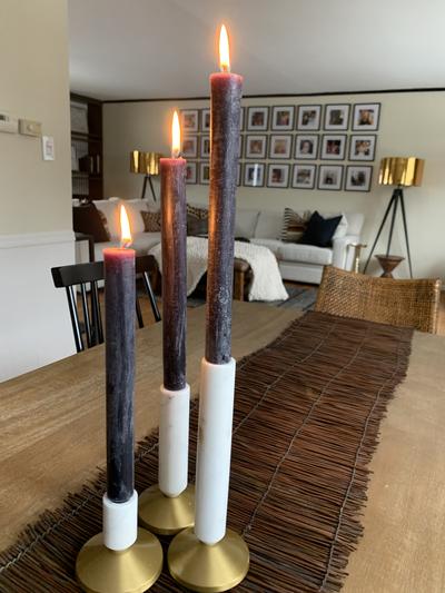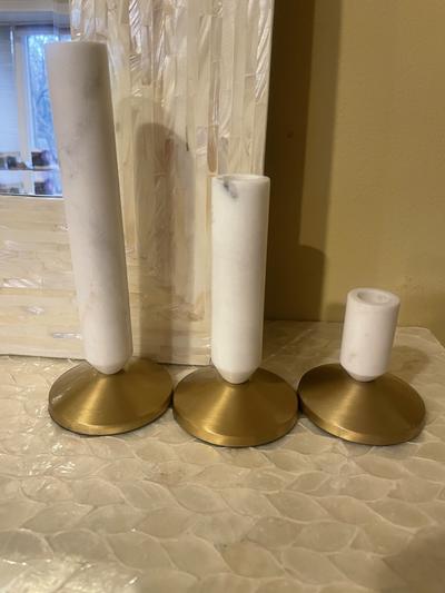 Hotel Collection of 3 graduated candle holders are gorgeous. The modern combination of the marble appearance combined with brushed brass creates a complimentary statement to both contemporary or traditional furnishings. My only complaint is the base for a candle is narrow. You would need to be attentive to the candle base size when purchasing your candles. Certainly not a deal breaker for the beauty of these candlestick holders.