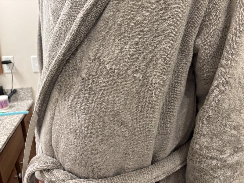 Unfortunately the robe as a big snagged on the let side right where is visible. Other than that my husband likes it