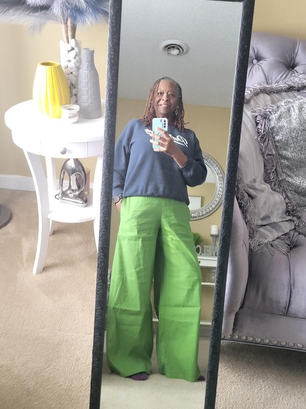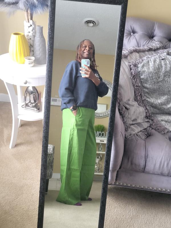 Purchased these pants for my mom and she loved them! They fit her well! Length is perfect for her. The wide leg gives it a cute flare. The color green stands out. It's like a kiwi green. She's so excited and can't wait to wear them in the spring
