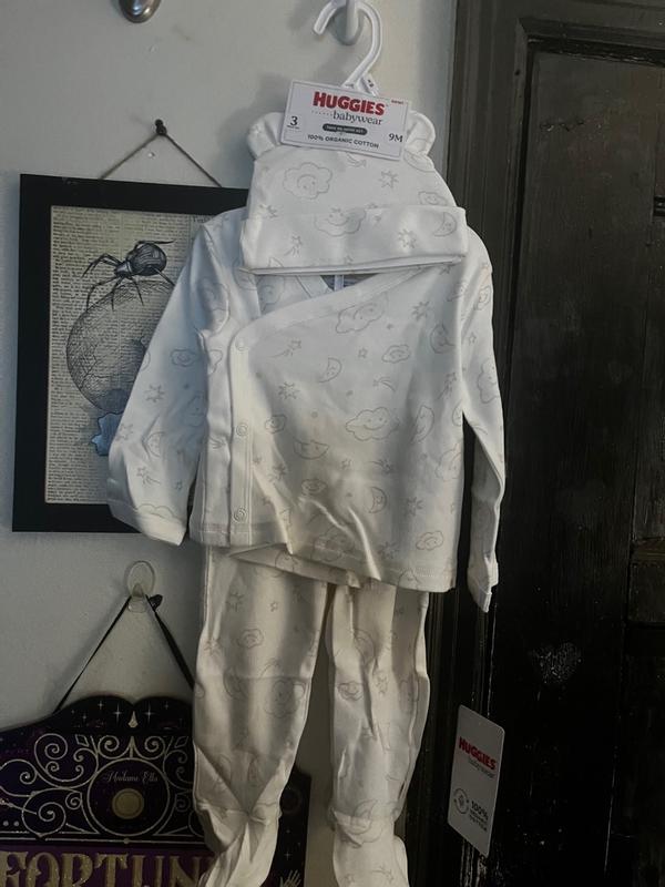 The Huggies 3 peice outfit is very cute and soft. However the sizing I would say is off. It’s too big for a 6 month old. So if you want a 6 month outfit to fit try sizing down. Other than that I really like this set!
