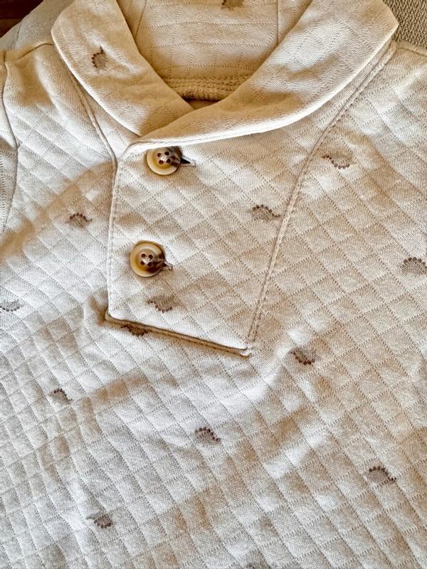 Design is cute and neutral. Material is soft, however, it is thinner than I was expecting. Fit is pretty true to size. Did not shrink a lot when washed