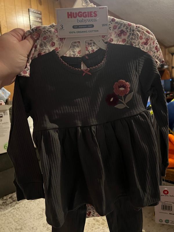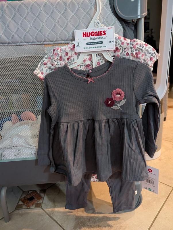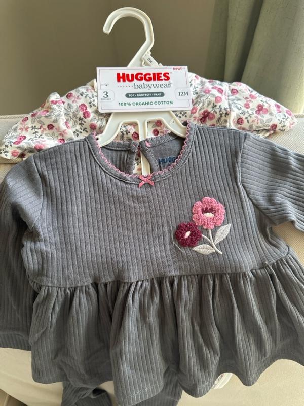 The Huggies Girl Flare Longsleeve, Bodysuit Pant 3PC Set design is adorable the flowers on the onesie are so cute and the outfit fits perfectly on our little baby girl. It’s really comfortable and has enough room for her to crawl around in it, it’s been really holding up well with all the crawling around she does it’s not showing any signs of wear at all. I love the softness of it. It’s a great 3-piece outfit I would highly recommend this cute little outfit for anyone who’s looking for a great outfit for their little ones.