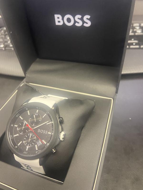 My son loves wearing this chronograph. The color of the white band makes it go very well with the denim & blazer look - the Boss logo is written on the band & it shows well. Lastly I loved the packaging, the cushion with the mysterious black box looks very high end, someone could easily play this off as a thousand dollar watch.