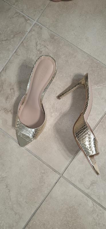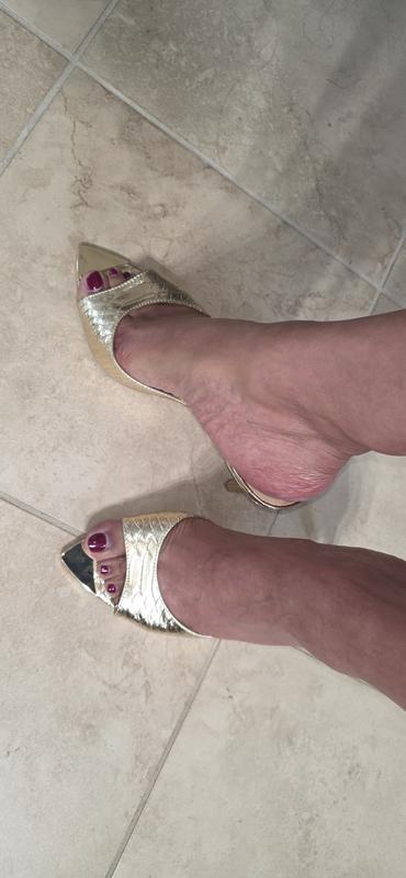 The INC emerald green slide sandals are very comfortable and the color is a true beautiful emerald green. I love the gold pointy toe. I own the same shoe but in gold in an 8 1/2, but I had to order a 9 in the green as my size was sold out. It still fit well, not too big.