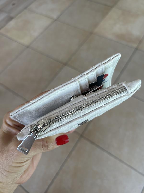 This little purse holds about ten cards, has two inner pockets as well as a change purse and a dollar slot. It's awfully pretty and very light and helps to keep my handbag clutter-free and weightless.