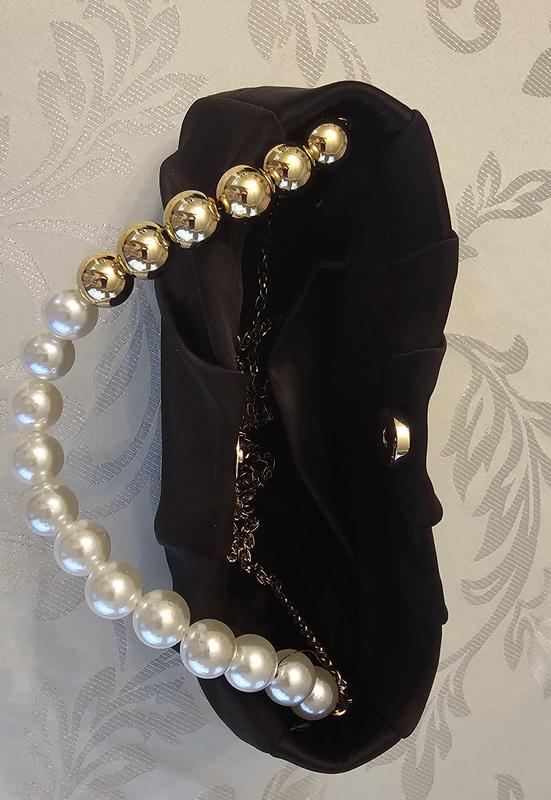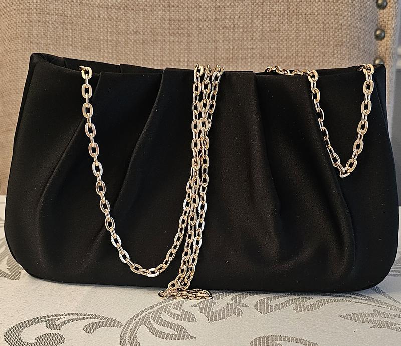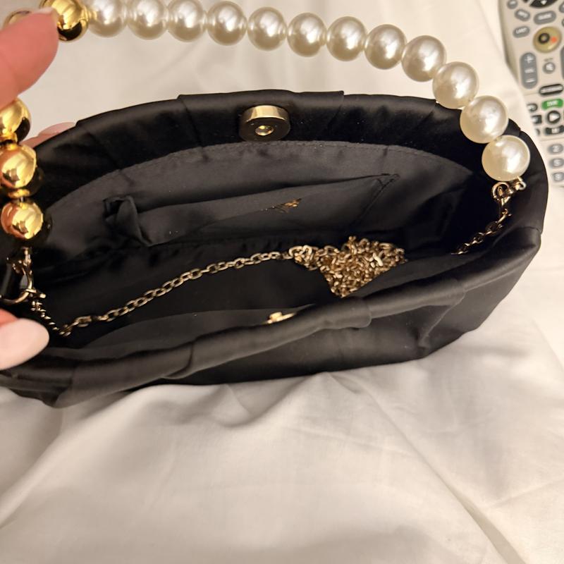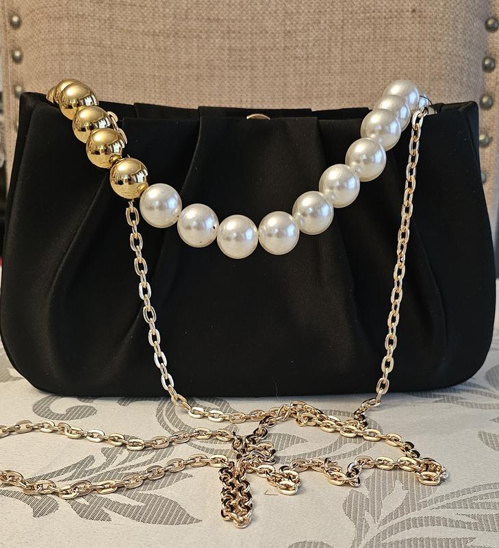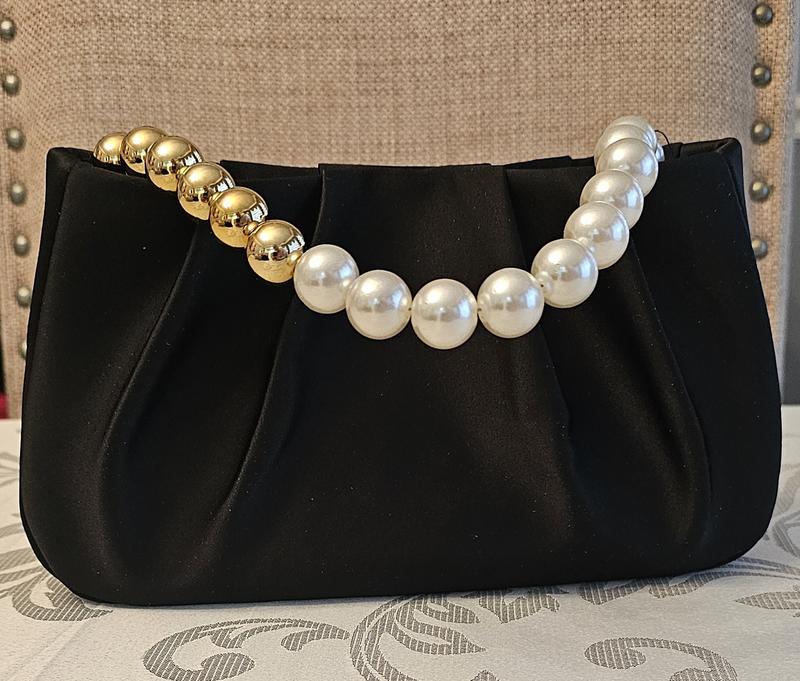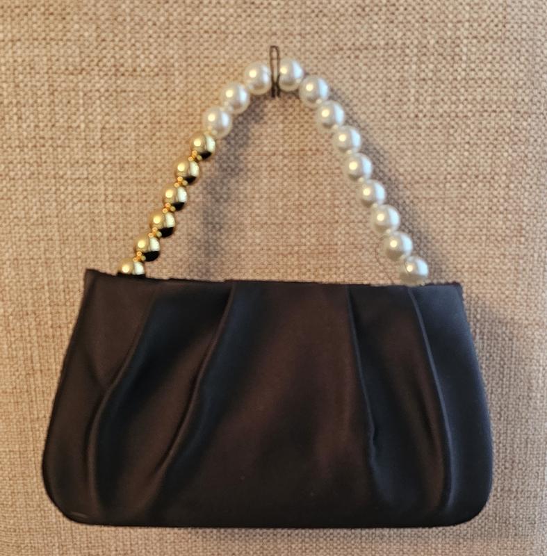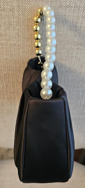 It’s a beautiful little evening bag. Black satin material with a gold metal shoulder chain, and a pearl and gold bead handle. You can tuck in either the chain or the handle inside the bag, it’s very versatile. It can easily fit my keys, cellphone makeup and more.