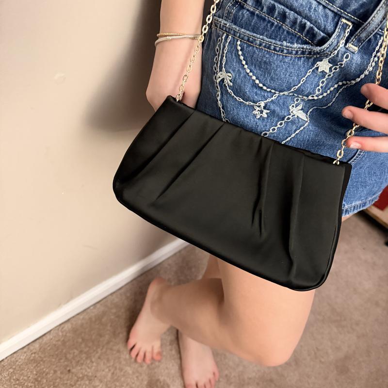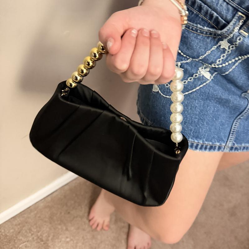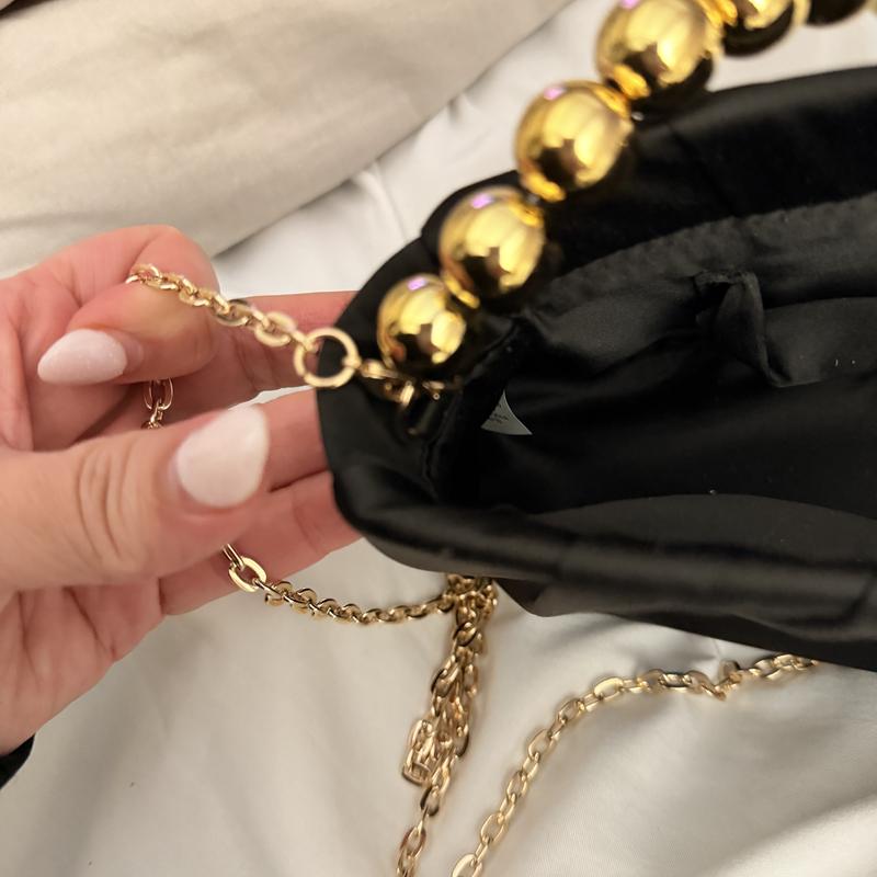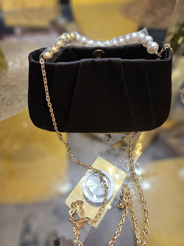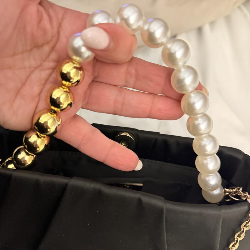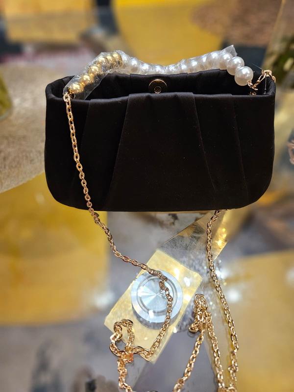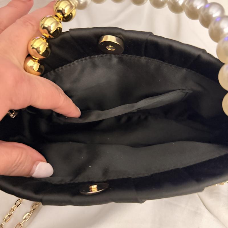 It’s a beautiful little evening bag. Black satin material with a gold metal shoulder chain, and a pearl and gold bead handle. You can tuck in either the chain or the handle inside the bag, it’s very versatile. It can easily fit my keys, cellphone makeup and more.