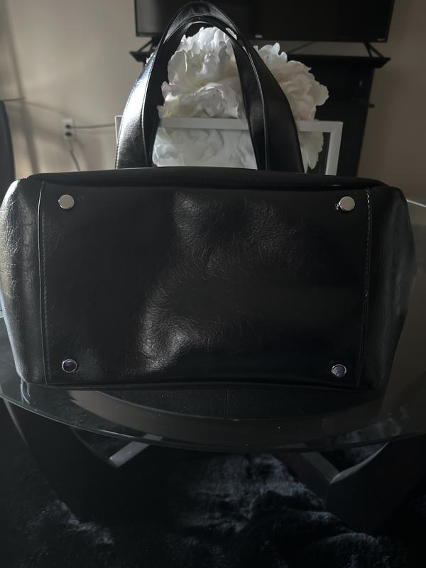 This handbag is very nice and super roomy! Also, not included in the online photo-round silver purse feet on the bottom. Elevates the bag.