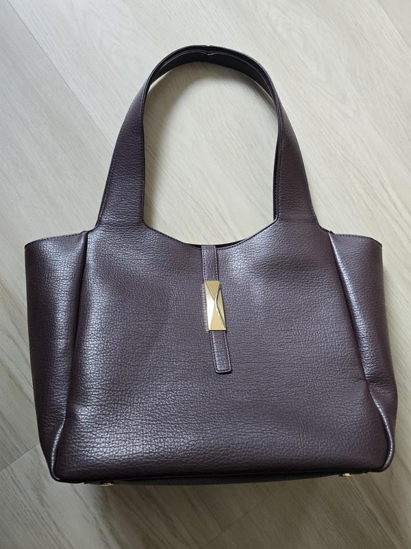 This tote is absolutely beautiful, perfect size, light weight, lots of compartments and the dark prune is so pretty. I love it.