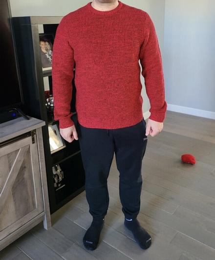 bought on clearance at bargain price (green color). 17 year old will wear this. It was helpful to read the reviews which described this sweater as having very long sleeves because my tall and very slender boy now has very long arms and I did not think I'd find any sweaters like that.