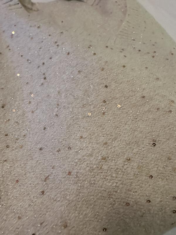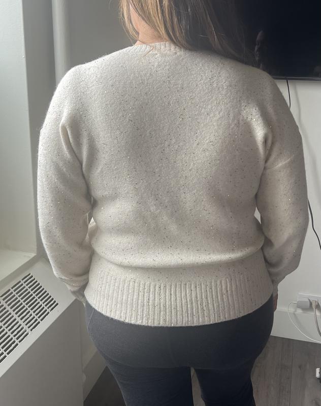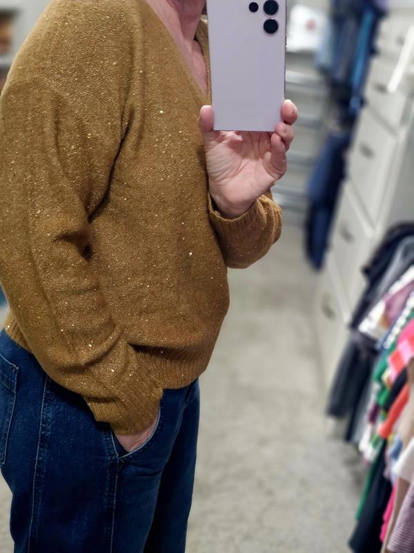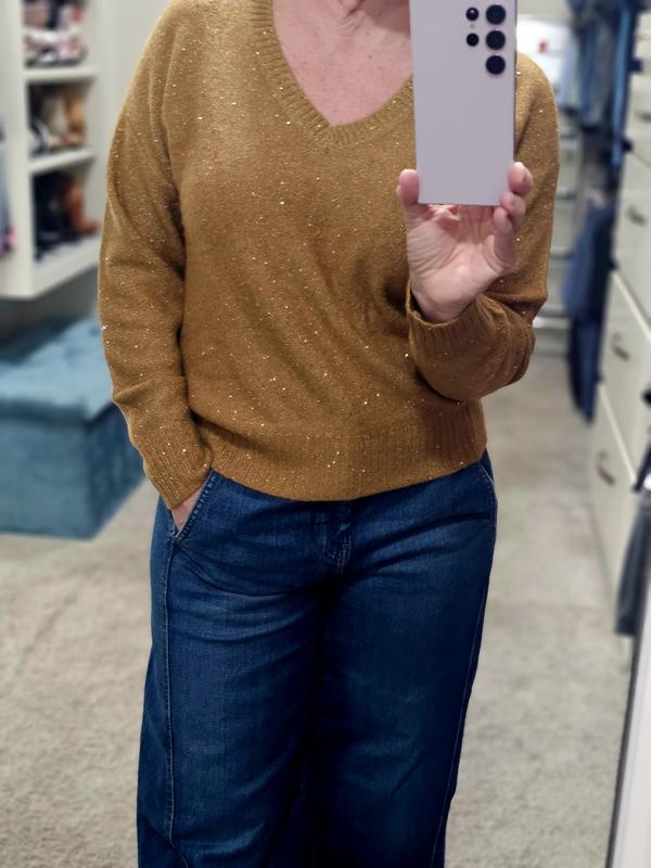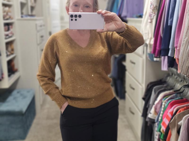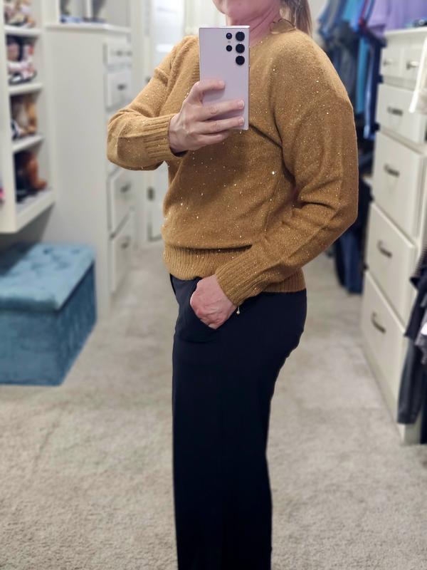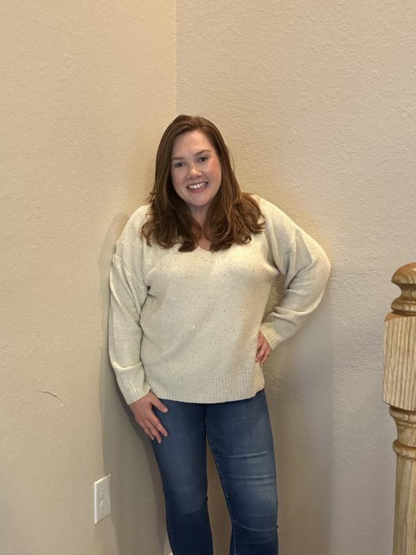 This sweater has sparkles which makes it perfect to wear for a special occasion or the holidays. I love the color and it fits perfectly. You can pair it with a dressy pants or jeans. Either way it looks great.