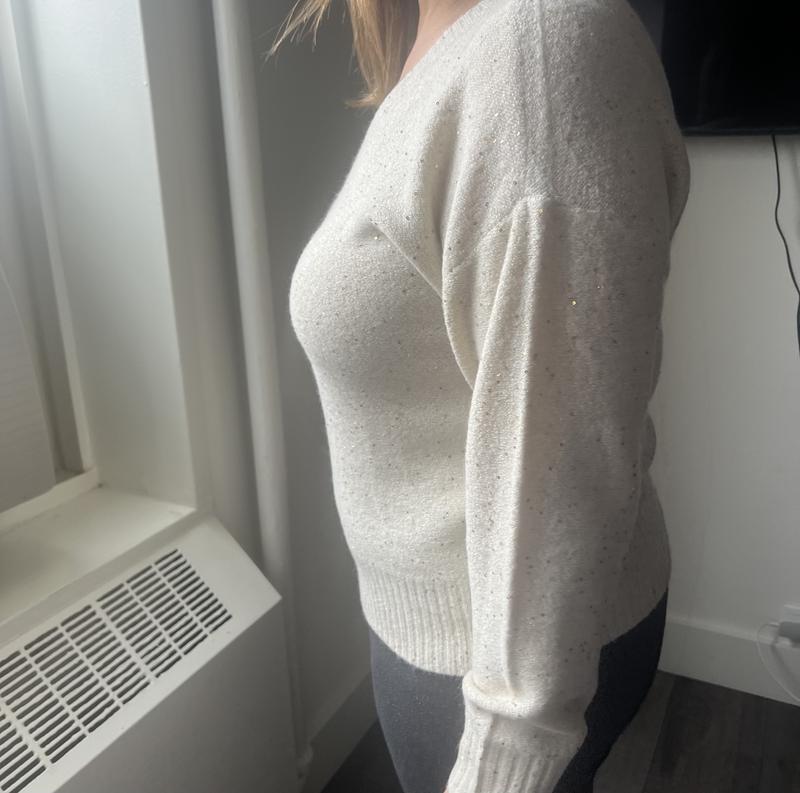 At first I wasn't sold on this sweater. However, as soon as I tried it on I was impressed. I love sequins but most of the time they are uncomfortable and itchy. This sweater is extremely soft and comfortable. It has just enough sparkle to make it a festive go to sweater for the holiday season. You can wear it with jeans or pair it with slacks to dress it up.
