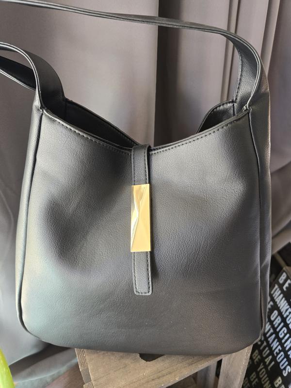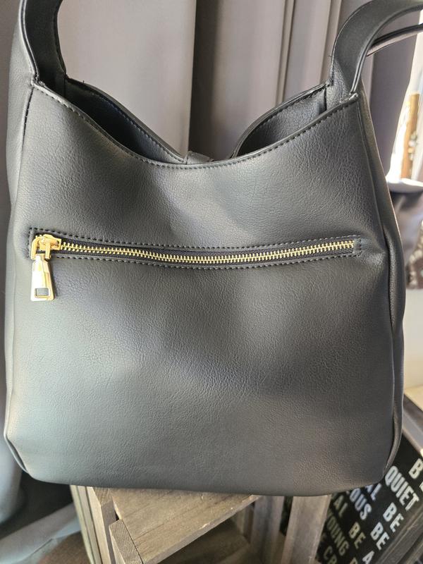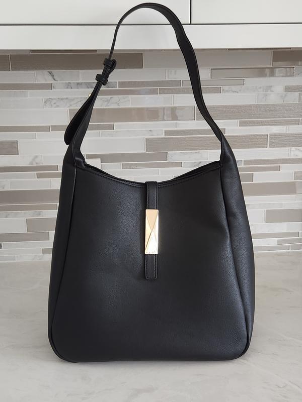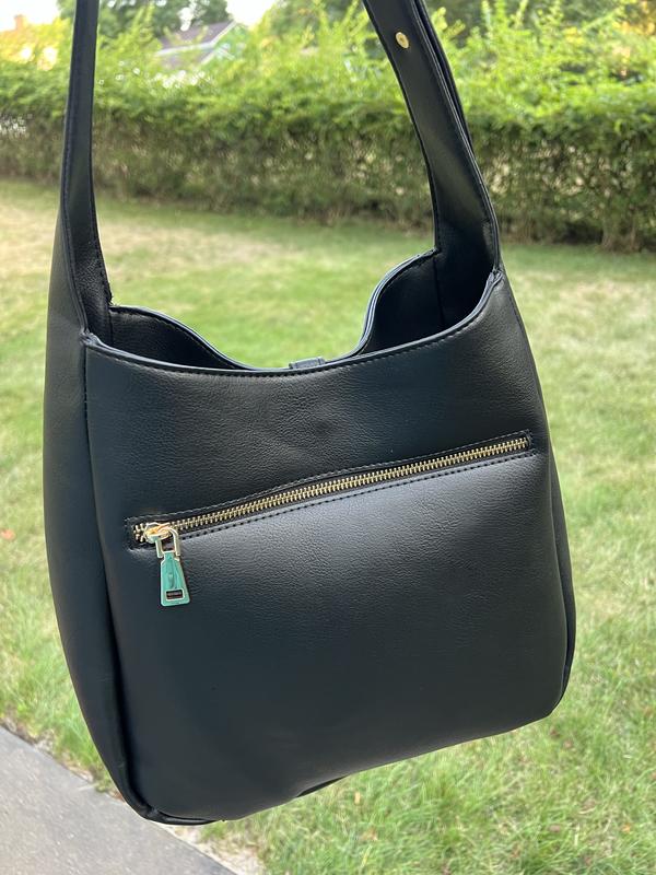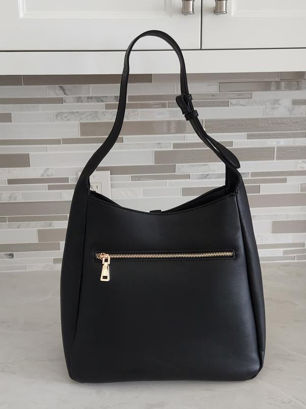 Nice purse. It's a little larger than I normally carry. I've tried so I don't need as organized of a purse anymore. This one has 1 big main section, but I was surprised that it has a full size pocket, almost like 2 sections (but the end one is very slim). It has 4 metal 'feet' on the bottom along with the interior zipper and double pockets. Good strap length, nice classic black with gold metal trim.