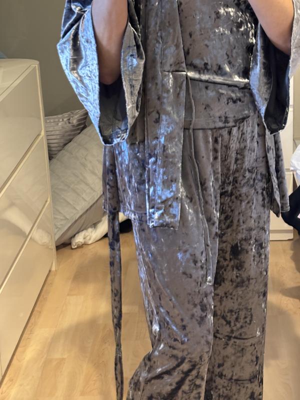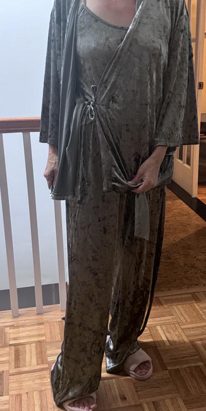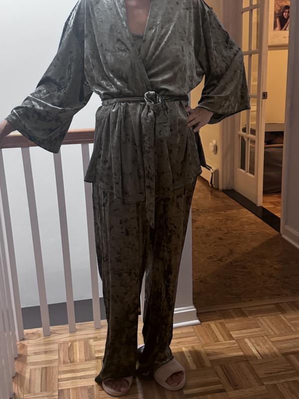 Beautiful and comfy velour pajama set. It comes with pants, a tank top and a kimono style robe. The pants are long and run a bit big, but the tank top fits a bit tight and runs short. I love the warmth and the feel of the material. These are perfect for fall and winter seasons. Great holiday gift!