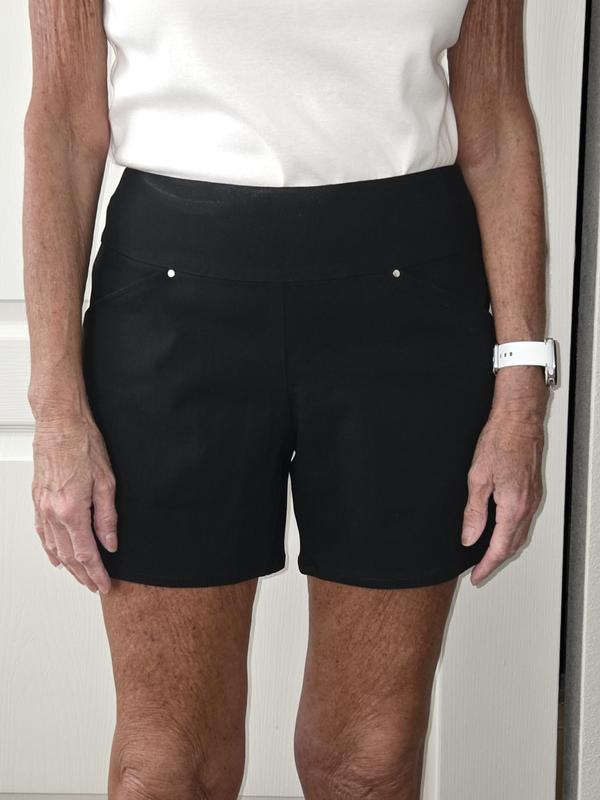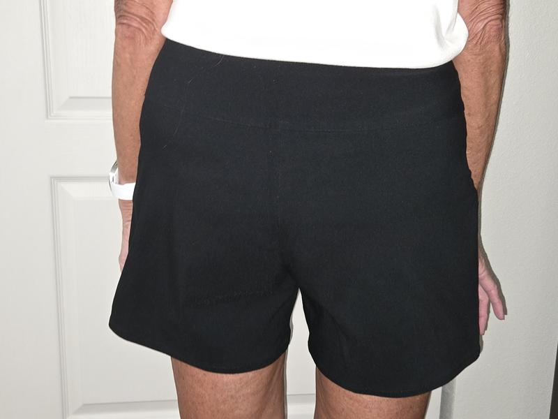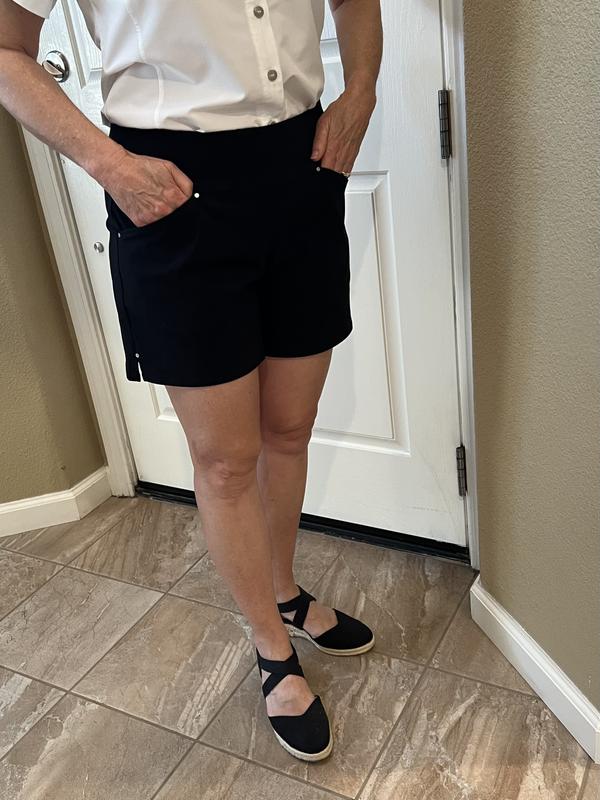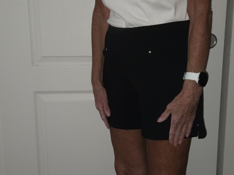 Stylish with angled front pockets (with a small silver shiny brad on each pocket), yoke waist and slightly flared hemline with a small slit on the outside edge. Upscale for casual or dressier wear. Pair with a tee shirt or blouse -- any solid or print would be nice with these black shorts. Fabric feels durable, yet, stretchy for comfortable. The 5" length is good for me since I'm only 5'3. The fit seems roomy for my size 6.