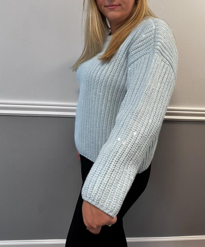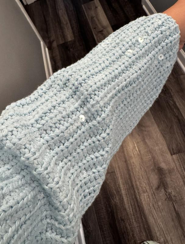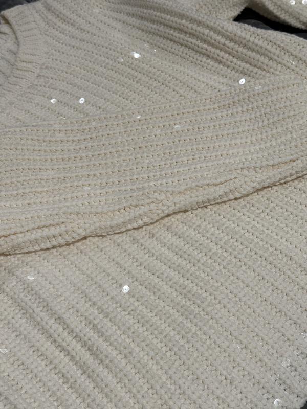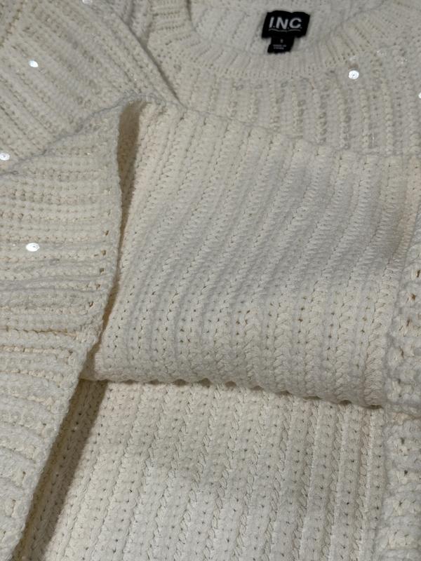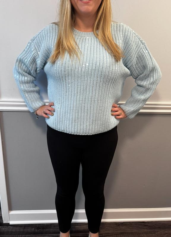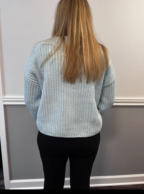 Comfy Sparkly Sweater! I am usually a size Medium in Sweaters but the Small fit really well. I am 140lbs 34DDD. The outside has Sequin but the inside of the sweater doesn’t, so it’s not itchy. I would recommend it but note that it is bulky.