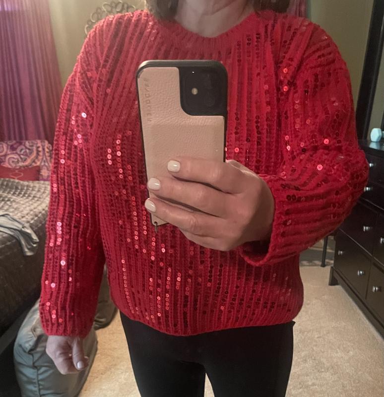 I’m really liking the fit and feel of this sweater. It has some weight to it but it seems just right for a fall/winter option. The sequins are just enough without feeling overwhelming and the fit was true to size. This is a nice semi-dressy or casual top for holiday events.