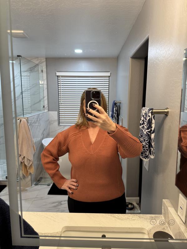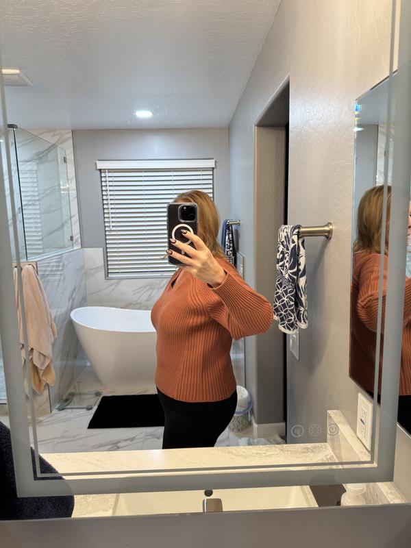 Absolutely love this sweater. The softness and look screams wear me !!!! The length sit perfectly hitting right below waist of pants. Design on sweater gives a rich look. This will be a staple sweater for me. This is a size large fit is accurate. Can’t go wrong with INC.