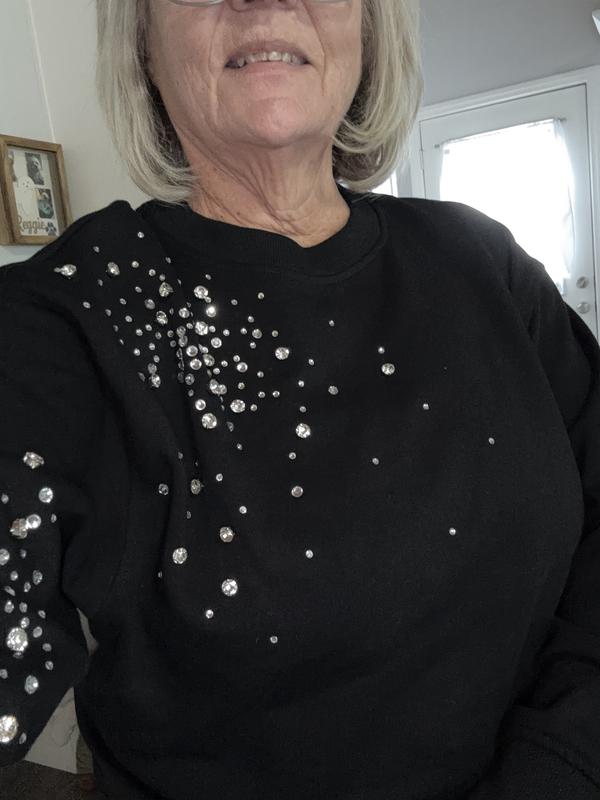 Reading the reviews (after my purchase!) I am curious why nobody mentioned the "bling stones" on the sweatshirt. The stones are VERY loose and I am wondering if they will survive in tact after a washing! It's a different look for a sweatshirt, however, so I will keep it and wash by hand.
