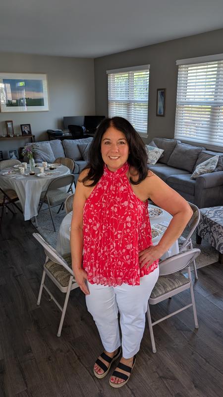 There is something so flattering about a halter neckline and this top has it. The fabric is pleated and flows as you move. I went back and bought the matching palazzo-style pants to make a whole outfit for a summer wedding. Just a gorgeous color.