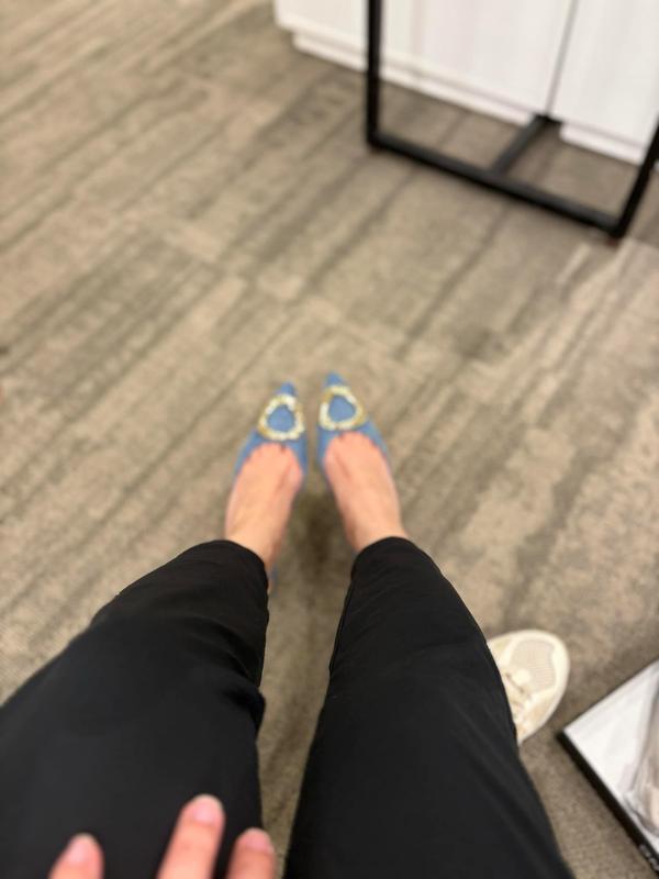 I absolutely love this shoe in the denim. I've recently been on a denim kick, and these were a great addition. The gold embellishment is perfection. I love them so much that I bought them in black, and I would also buy them in gold, but they're sold out now in my size. The only downfall is the straps keeps falling off the back of my ankle but I had a quick fix, adding a hair tie around my ankle to keep it up. This will only work for wearing pants unless I get creative and get a cute little beaded hair tie. Regardless, it's still worth since I got a good deal, it seems as the black ones are little bit more fitted, so the straps don't fall down but I haven't worn them yet for a day. Shoes are relatively comfortable