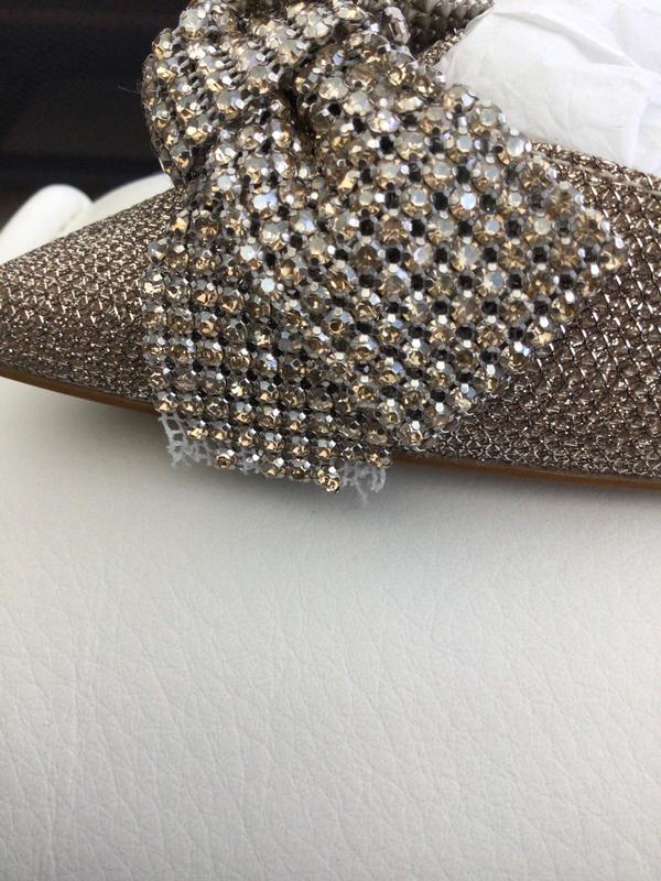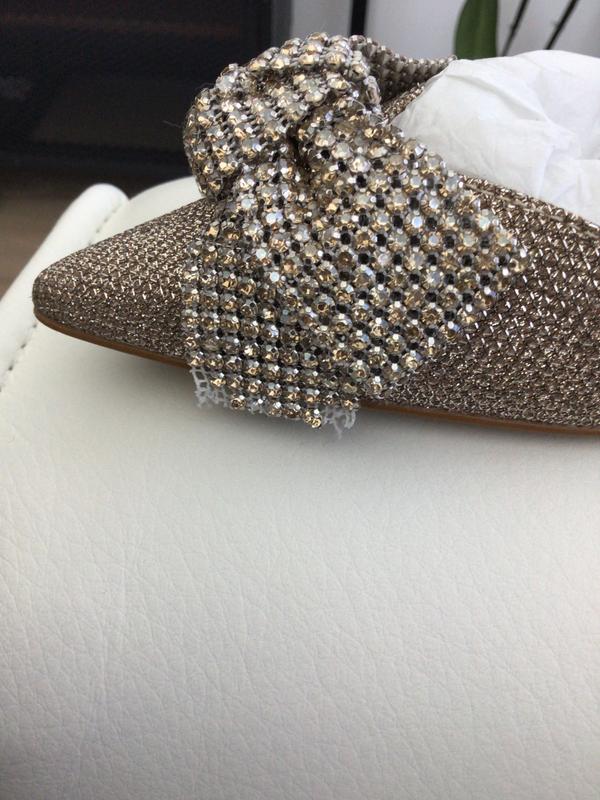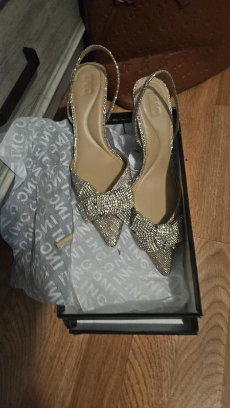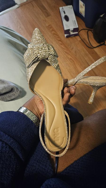 These shoes are a beautiful gold color. They are well made as the rinestones remain in tack on the bow. I wear a size 11 and these fit perfect. They are not tight at the toe. The heel is a nice height as I am getting older and need low heels. The shoe is comfortable and very stylish.