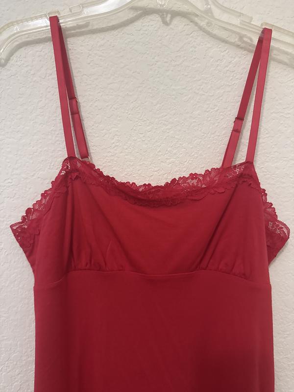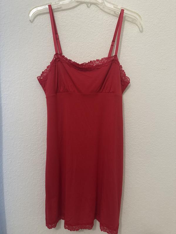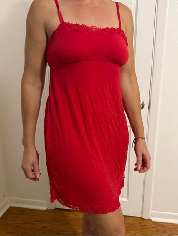The nightgown is a beautiful shade of red. The color is great for Christmas and Valentines Day! I’m 5’2, 100 lbs and the XS fits well. It hits right above my knee. I like that it has adjustable straps and the lace is not itchy. The lace along the hem is a nice touch. Very comfortable to sleep in. I do feel that the material is slightly on the thin side.