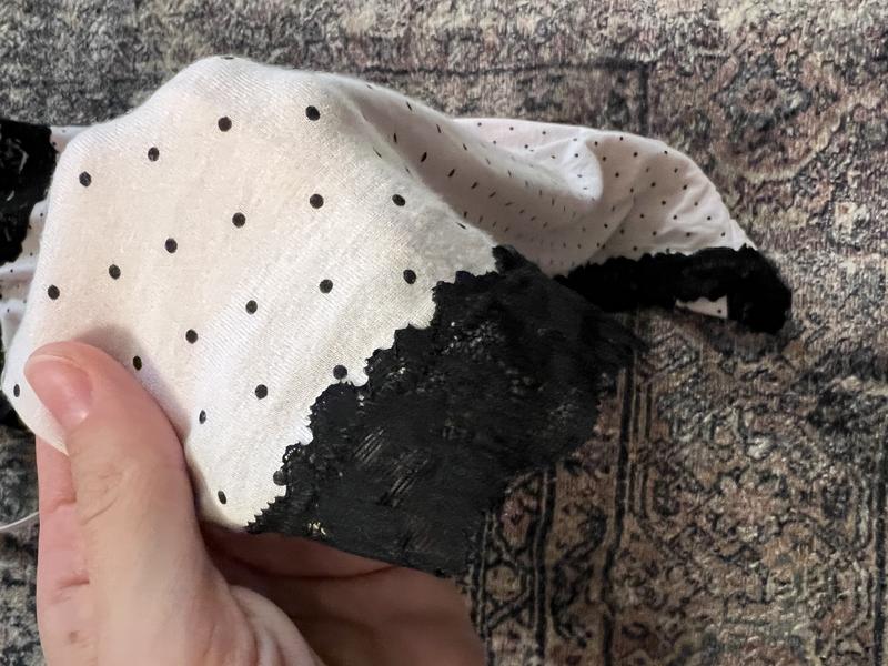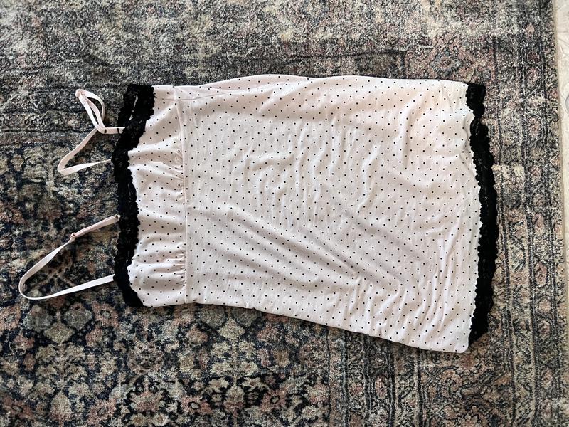 This nightgown is very comfy yet still very feminine. The light pink and the black polka dots are so pretty together and make for a lovely nightgown. The lace detail is very pretty too. It fits true to size.