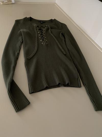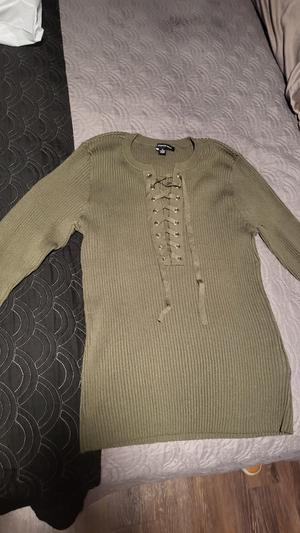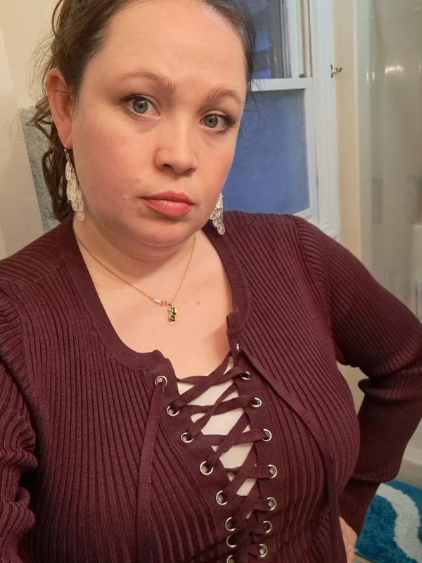This top was two sizes too small. I have purchased many sweaters from I.N.C. and all of them are XL. This one was so tight that it rose up and showed my stomach. The lace-up portion is more open than the picture depicts and is too revealing for my taste. It is a final sale item that I cannot return, so I'm out of luck and will likely give away to a smaller and younger person.