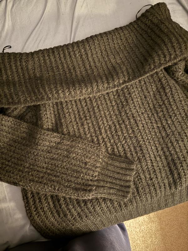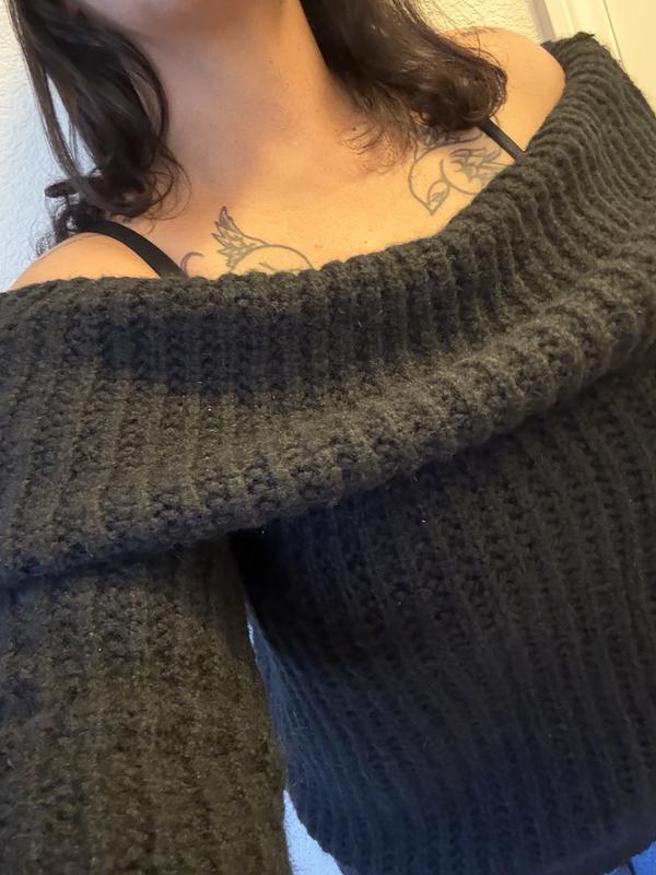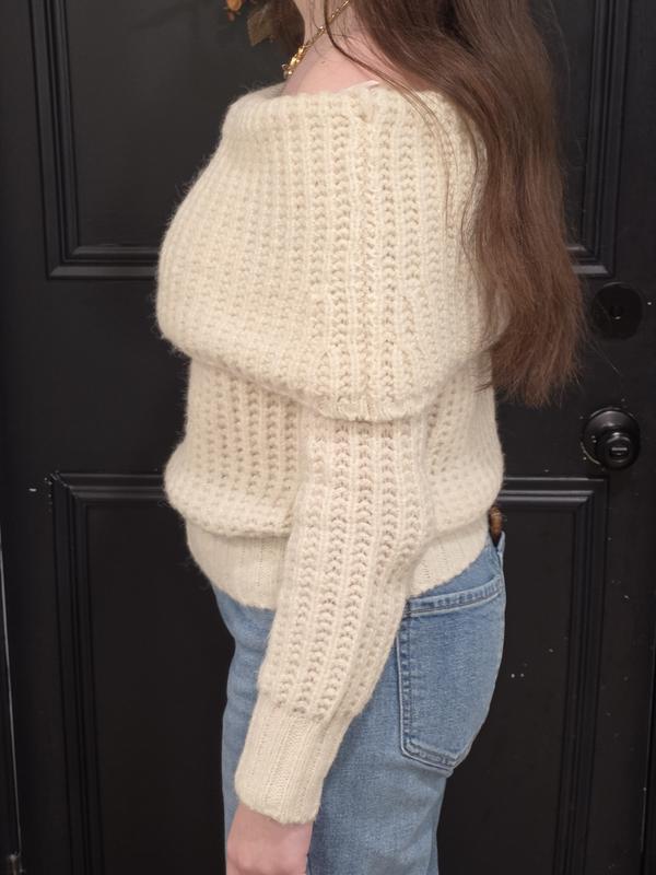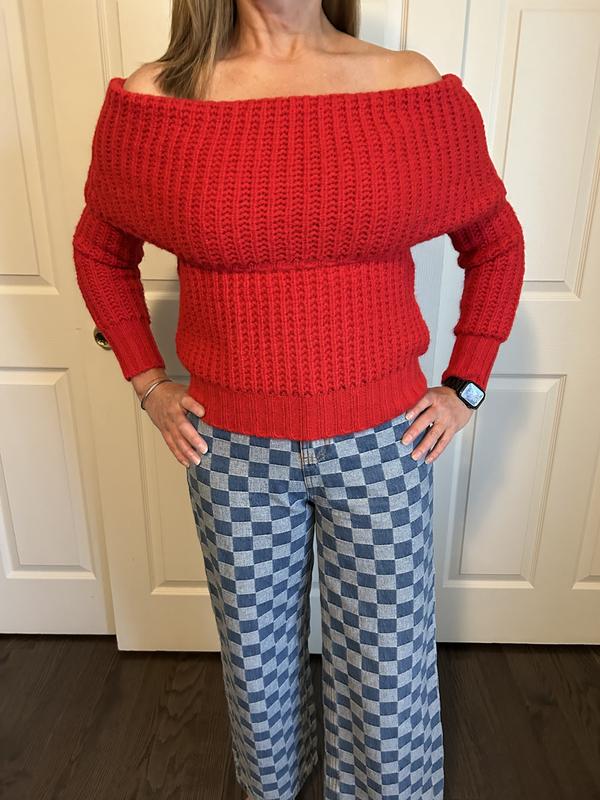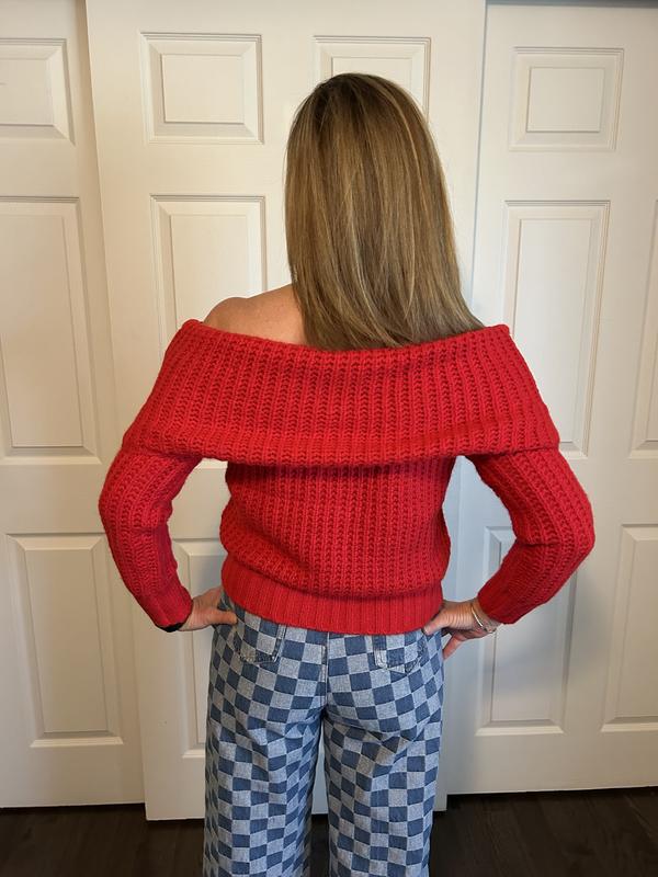 This is a really nice sweater. The red is a true vibrant red, which I love. The "off the shoulder" part actually stays down. In general, the sweater is very soft. This sweater is made with 7% wool. (Wool normally makes my neck and chest itch. Since it is not against those areas it is fine.) The ribbing is nice. It doesn't feel bulky and big. True to size. I like how versatile this sweater is. It can be worn with jeans or on a night out with black pants/trousers, if you want to dress up.