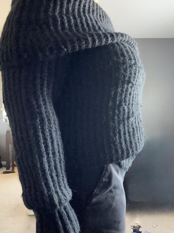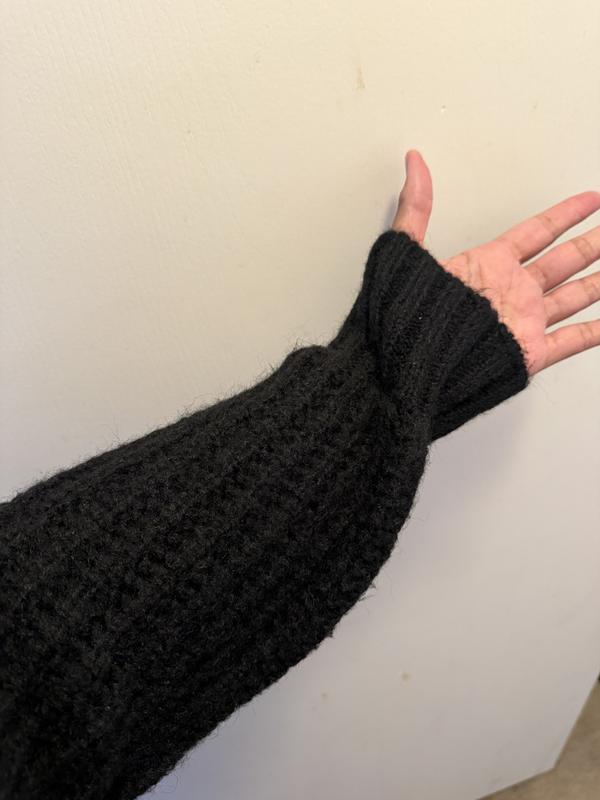I was super excited about this sweater, but it ended up not being all I thought it would. The sweater does fit to size and is not too long or cropped, and the length of the sleeves were perfect, but the material itself is rather itchy. Ive worn it once, and the material is already starting to shed. The fold over is cute, but unfortunately did not stay folded over and I had to keep adjusting it. Looking at it straight forward, it looks flattering, but looking from the side, not so much.