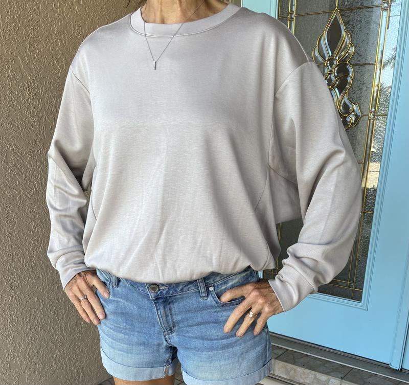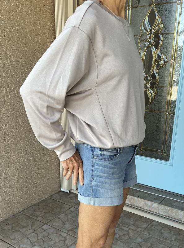 This top is very versatile and so comfortable! You can wear it for lounging around the house, wear with jeans for casual or add some jewelry and fun pants for an outing with the girls. It’s oversized for comfort but waist is cinched so it does not look frumpy. A combination of style and comfort!