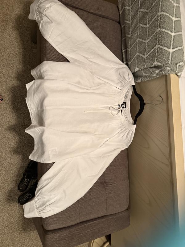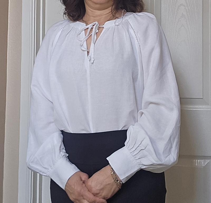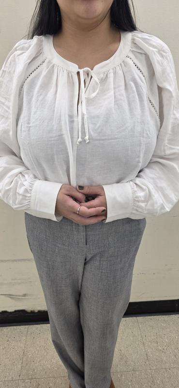 Received a good quality white linen, soft to touch but not too delicate. Since it is white it is a little see through but wearing a nude bra is suffice. It is true to size. I love the classy details such as tie neck style, a little peek through shoulder and dolman with cinched arm. Perfect for formal pants or skirts.