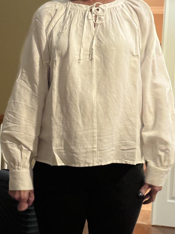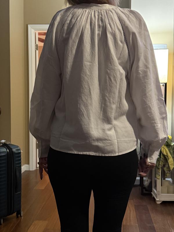 Bought the green parsley color, it's a bit disappointing, not vibrant like photo, kind of dull, some might appreciate that. The center seam in front of this peasant style blouse ruins it for me. That is just cost cutting construction that looks bad and the price point on this blouse doesn't justify that, imho. Sleeves are pretty, I enjoy the fullness but could be a little bit longer to blouse over the cuff a bit. Fabric is an odd linen blend, again, a cost cutting choice I would guess. 100% linen would be so much better. Haven't decided if I will keep it or return it yet.
