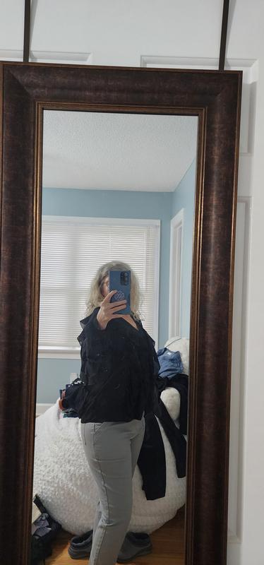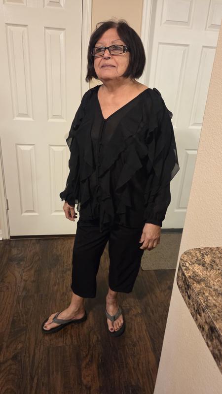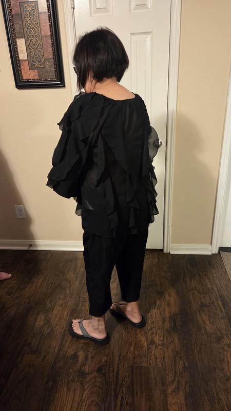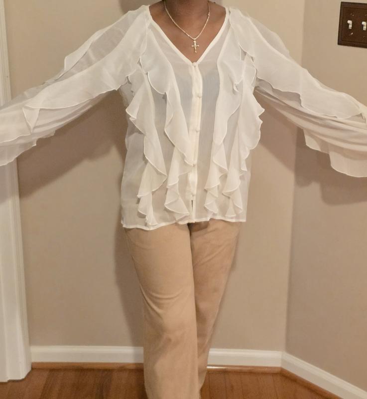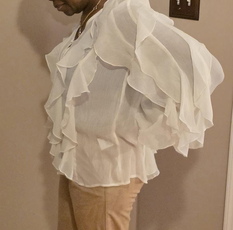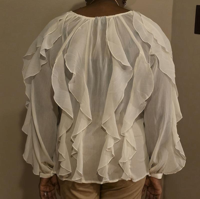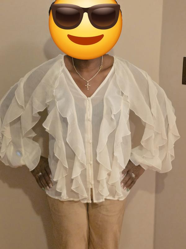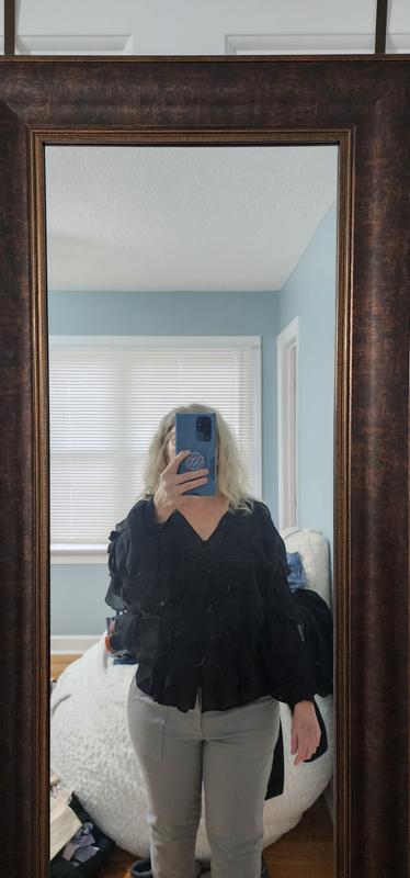 I really love the look of this blouse. The ruffle detail is beautiful and gives it a feminine, elegant feel. The black color makes it easy to dress up or down. The fabric feels lightweight and comfortable, perfect for work or a dinner out. It does run slightly roomy, so keep that in mind if you are between sizes. Overall, it’s a stylish statement piece and I received several compliments when I wore it. For reference I ordered size L and weight 165 lbs. 5'2"