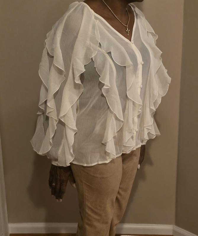This top is cute. The ruffles give it depth and dimension. They also take away from the fact that it is very sheer and practically see through. The color I received is not my favorite and does not look good against my skin. I took off stars on my review for the sheerness of the top, as well as the color. I got a size large and it fits well, however, I like my tops a little more loose which would require me to size up. For reference, I am 5'7", 200#, size 14.