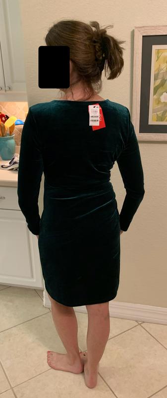 Nice quality velvet dress. I am between sizes BUT was able to fit a medium in this dress. Large was too big.