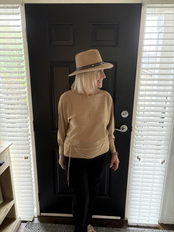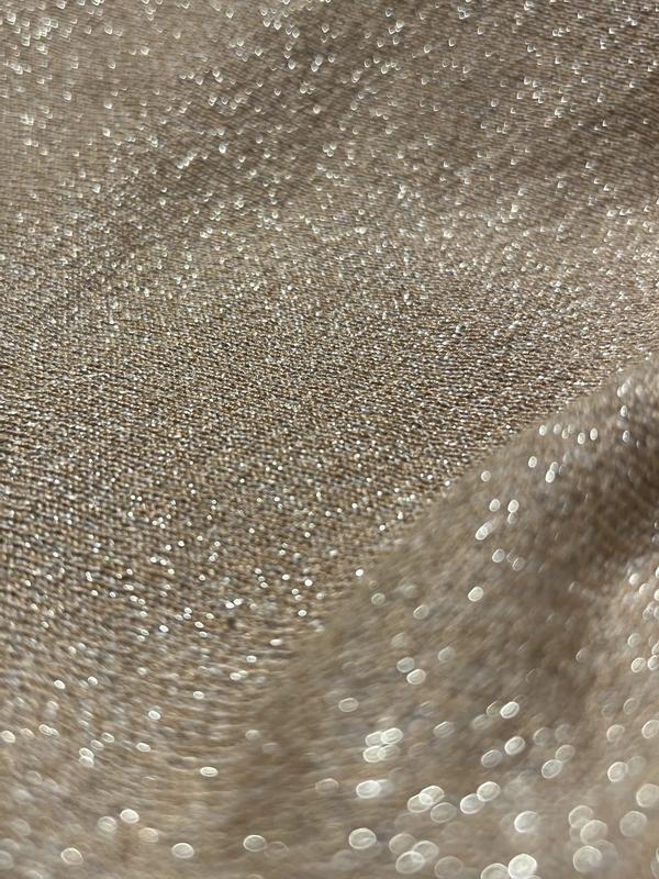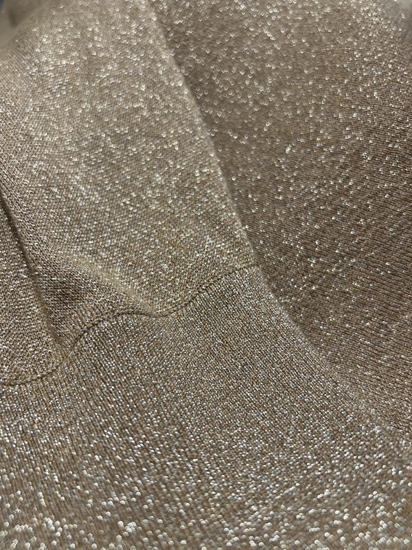 Festive metallic threaded gold (taupe) sweater is perfect for the holidays. Fitted waist and tapered sleeves with roomy middles. This top can easily be dressed up for parties or dressed down for every day wear.