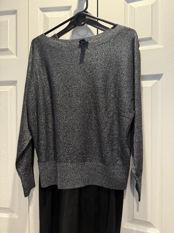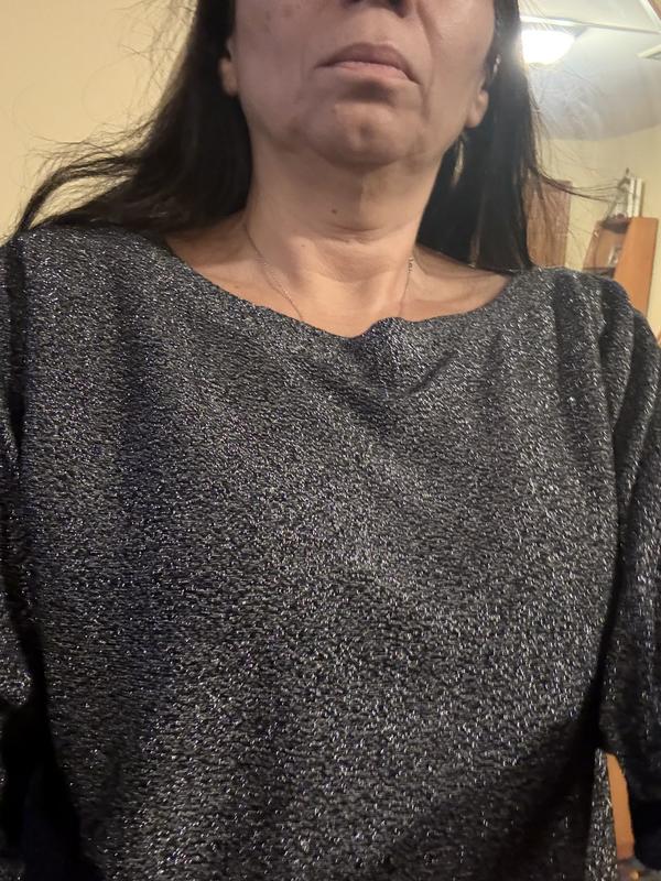 This is a pretty top, it fits a bit loose, I purchased the Medium, thats my usual size, its not too sparkly, its a boat neck, looks great for going out, especially with black slacks , its a thin material