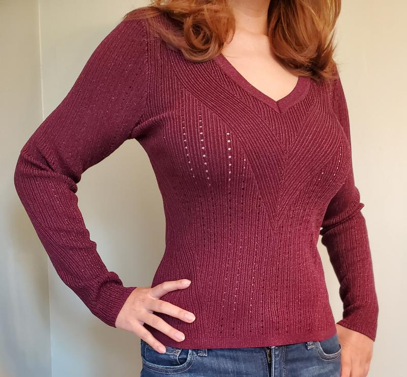 I really wanted to like this V-neck sweater, especially for the upcoming holiday season, but unfortunately I did not. The top is sparkly, form-fitting and flattering but, as others have mentioned, it is scratchy and uncomfortable. I also did not care for the small holes throughout the sweater.