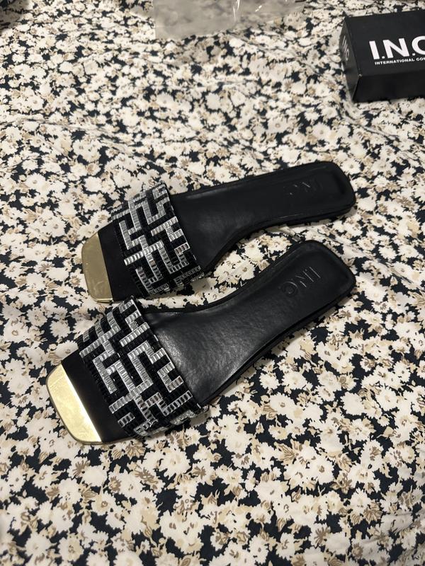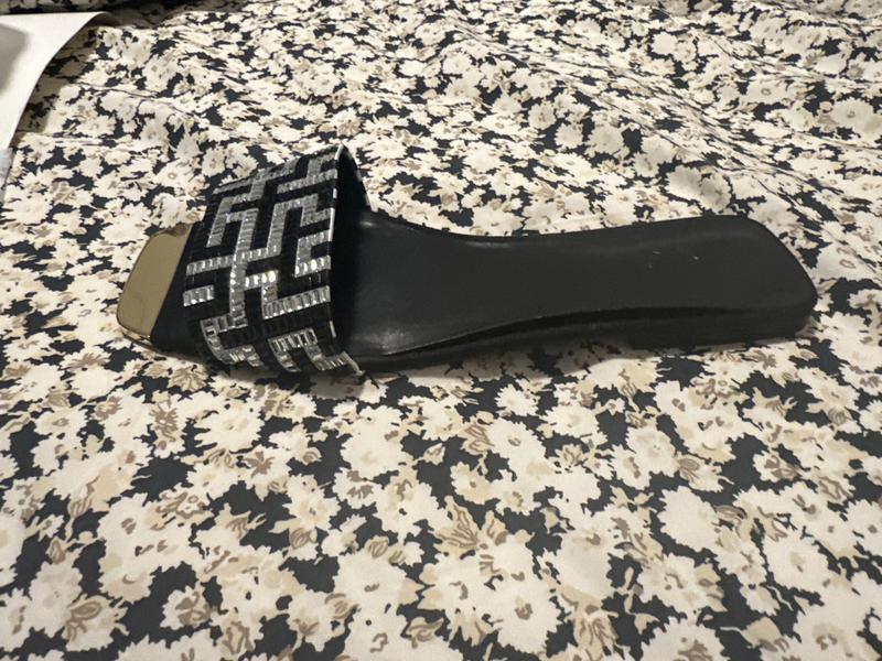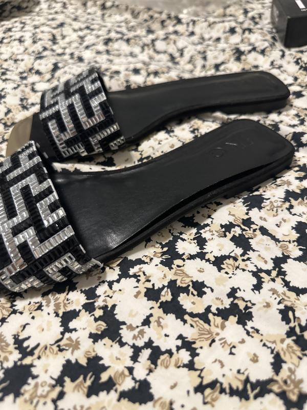 Beautiful slide with black and white attire. Received a lot of compliments on color coordination. Bought true size 9.5 wears well.