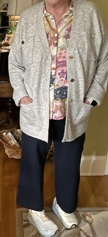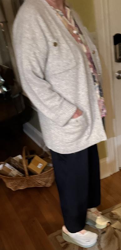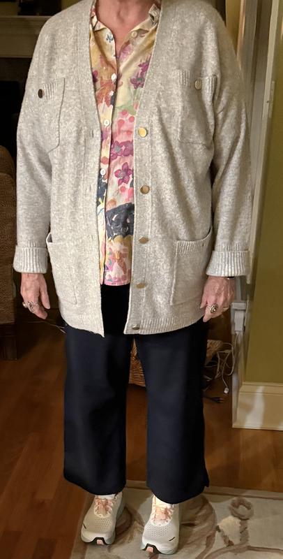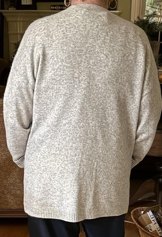 I ordered both M and L for this cardigan since I wasn’t sure how it would fit. Unfortunately neither worked as I am petite, 5”1, 140 lbs. Even the M size especially the sleeves were too long and too loose. I liked the length of it. This cardigan was quite heavy for me. Someone who likes warm sweaters would appreciate it. The material was nice but not sure if it would pill in future. It was a dressy and comfortable cardigan and would look great with leggings. The grey color was very pretty and the buttons were elegant. Sadly both sizes had to be returned.