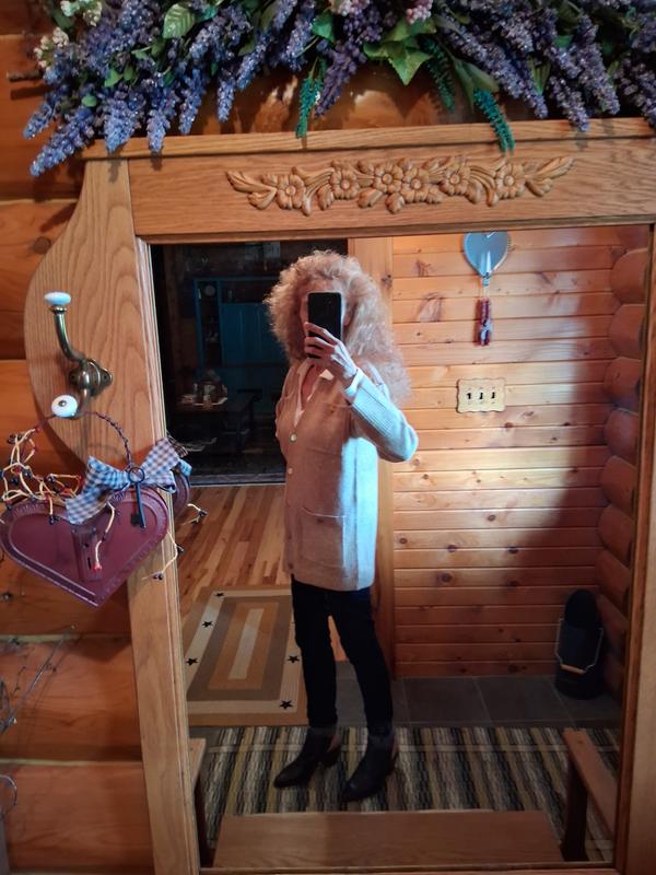 This cardigan is so cute, comfy and cozy! It’s true size/maybe runs slightly big but not an issue with a cozy sweater. The material is so incredibly soft both inside and out. The large gold buttons dress it up a bit. It’s so perfect!