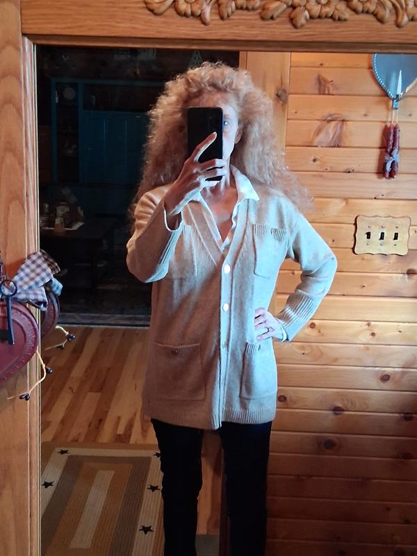 I'm pleased with this buttery soft cardigan from INC. It is generously sized. The warm walnut heather has a mottled look, great for pairing with a variety of colors - brown, khaki, blue, red, or black. The 4 pockets are generously sized and the shiny gold buttons accent the sweater beautifully and are attention grabbers. The cardigan does run large. I chose a small, but an XS would be a better fit for me (5'6", 112 lbs). This is a great cardigan for long walks in the fall, snuggling in front of the TV, or lunch with the girls. The sleeves are wide mouthed, so scrunching them up is not an option.