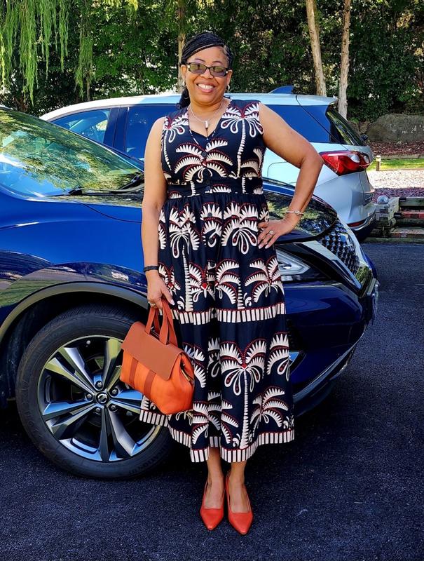 Love this dress. Perfect fit l, very comfortable and the fabric is 97% cotton making it great for summer. An improvement would be to make the lining 97% cotton also. The pockets are a plus !