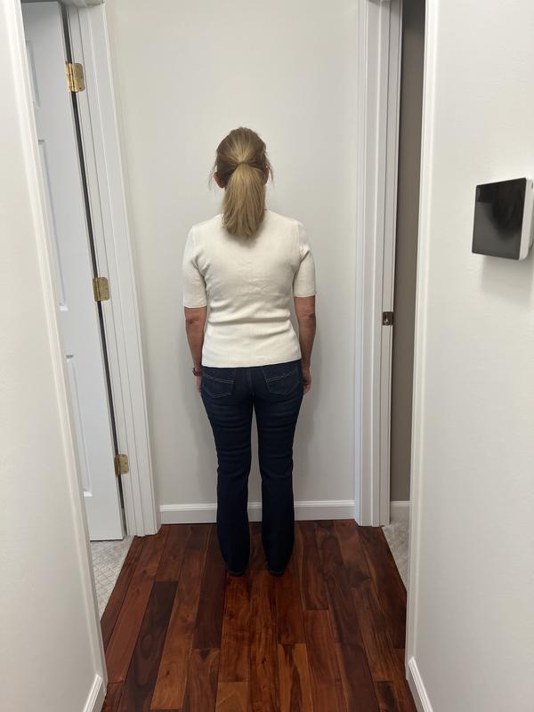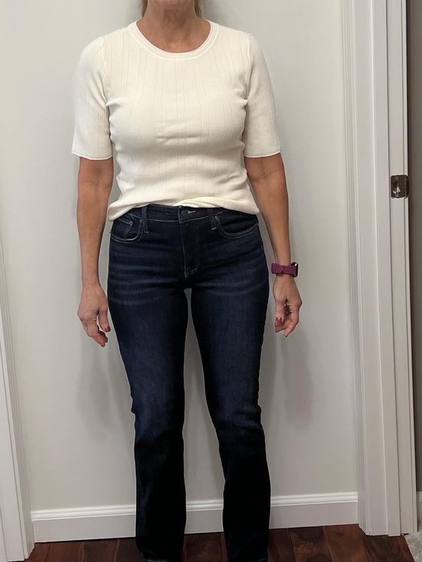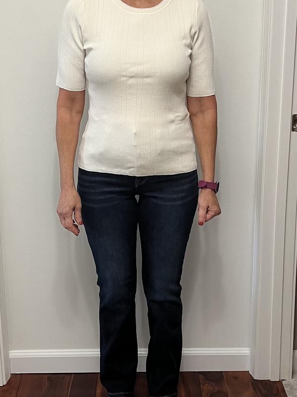 This top is a great knit that fits well without clinging. The ribbing adds a nice contrast to the top that helps it stand out with both my jeans and my dressier skirts. The material is soft and not thin which allows the top to keep a great shape. It’s not heavy so it still breathes, which is great for the hotter weather in Florida. The short sleeves fit comfortably around my upper arms. The overall size fit me, and I really appreciated that it didn’t cling around my waistline. I do like a bit more room in my tops, but it fit true to size for what I wanted. It’s a true black so it will pair well with my fall/winter wardrobe, but I’ll get some use out of it moving from late summer into fall also with the short sleeves. I paired it for work in a nice rust colored linen pants and it worked great for a casual day at work. I can't wait to dust off my fall boots in a few weeks and wear it with my jeans.