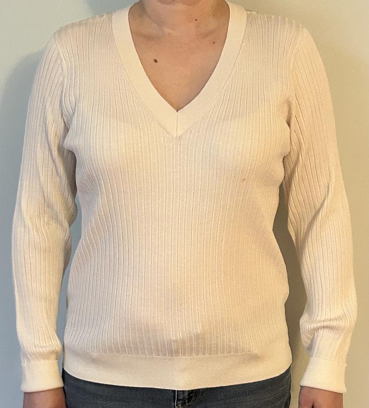 This ivory colored v-neck sweater is very soft and comfortable. The sleeves are a little long but the rest of it fits well. The material is made of polyester and viscose and feels soft against the skin. The ivory color is pretty and will match just about anything.